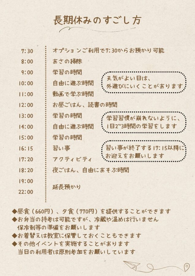 - 宿題・学習サポート(1日2~3時間の学習タイム)
