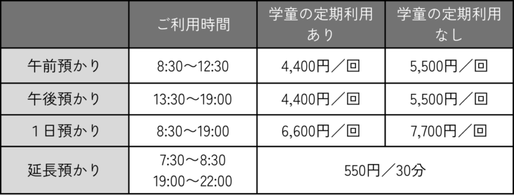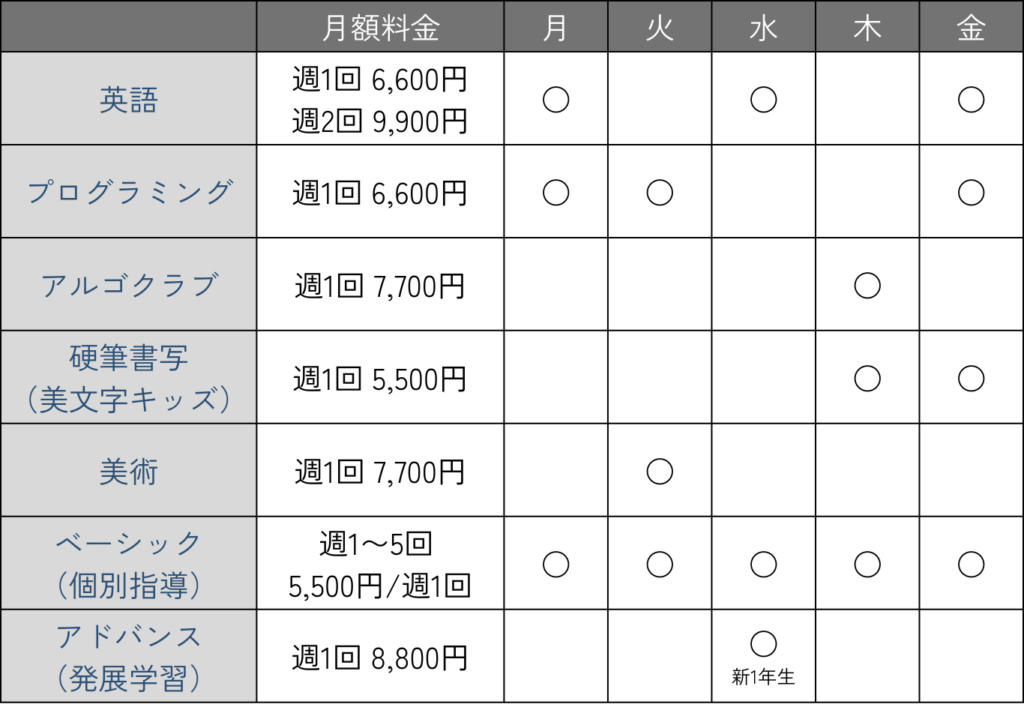 | 徒歩でのお迎え | 芝園小(最初の2週間は無料) |